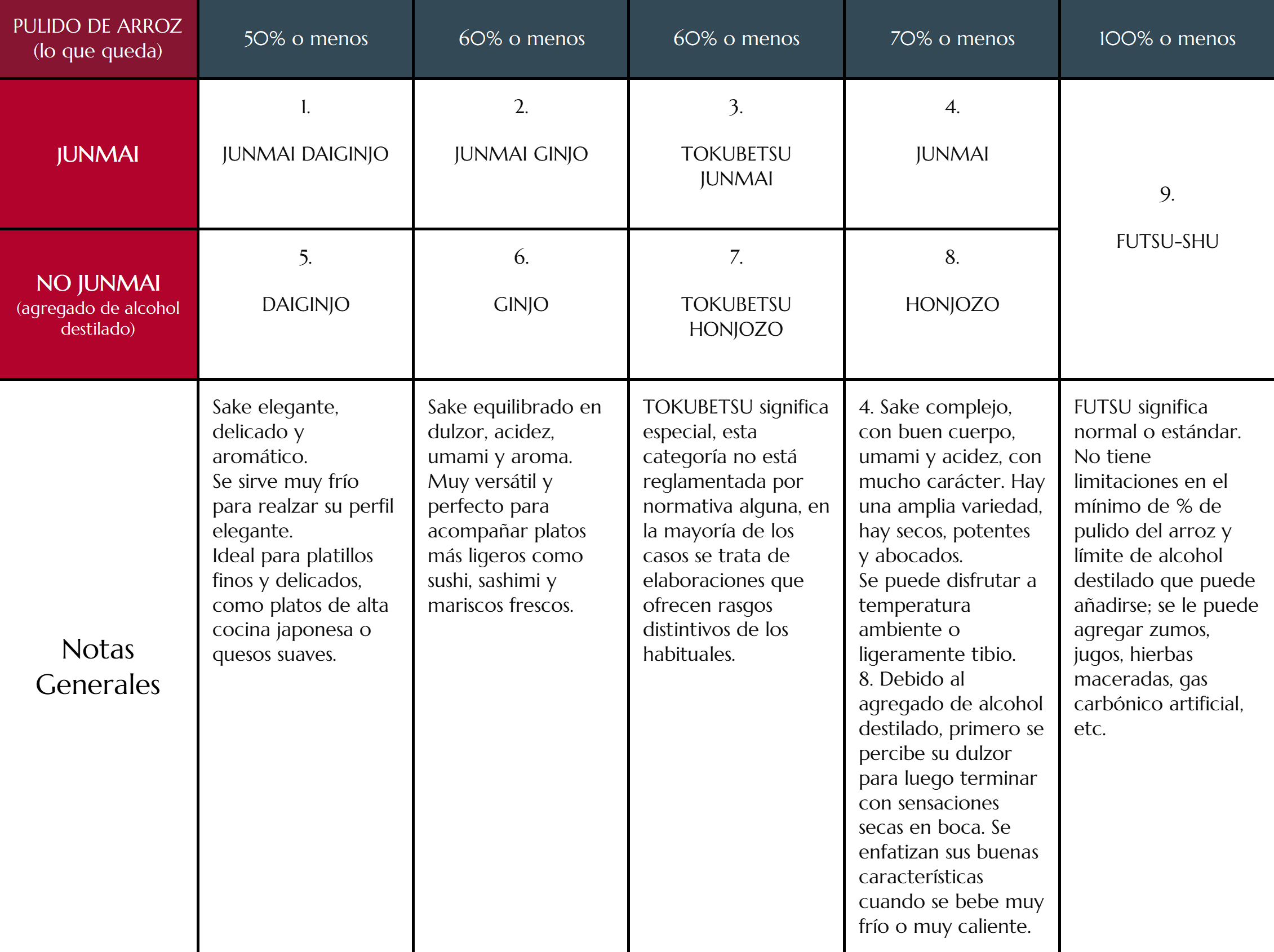 El sake se clasifica en nueve tipos principales según el grado de pulido del arroz y la presencia o ausencia de aditivos de alcohol destilado.
