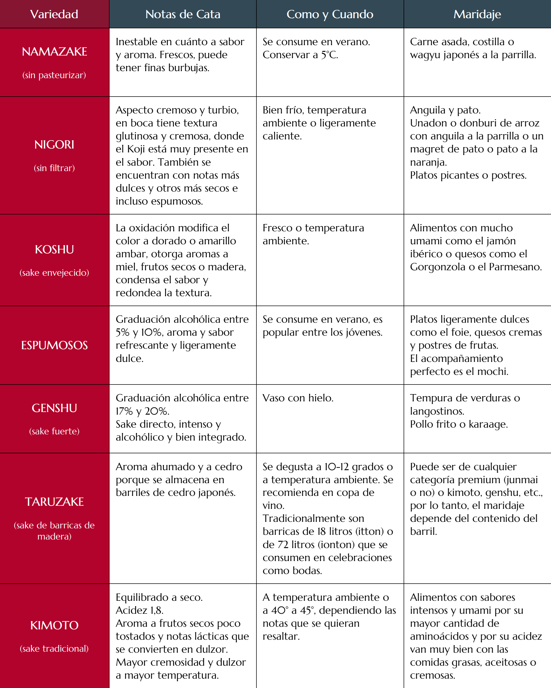 Finalmente, el Kimoto, sake tradicional con equilibrio seco, aromas a frutos secos y una cremosidad distintiva, se puede disfrutar a diferentes temperaturas para resaltar diferentes notas y combina bien con alimentos ricos en sabores intensos y umami, como las comidas grasas o cremosas. Con estas variadas opciones, el sake no solo es una bebida, sino una experiencia culinaria en sí misma.